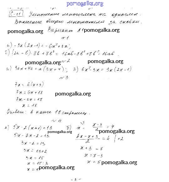 Трать меньше времени на решение домашнего задания. Зайдя на помогалку, вы найдете все подходящие ответы к Самостоятельным и контрольным работам Алгебра 7 класс Ершова, Голобородько на упражнение СР-11. Умножение многочлена на одночлен. Вынесение общего множителя за скобки самостоятельные работы вариант А-1