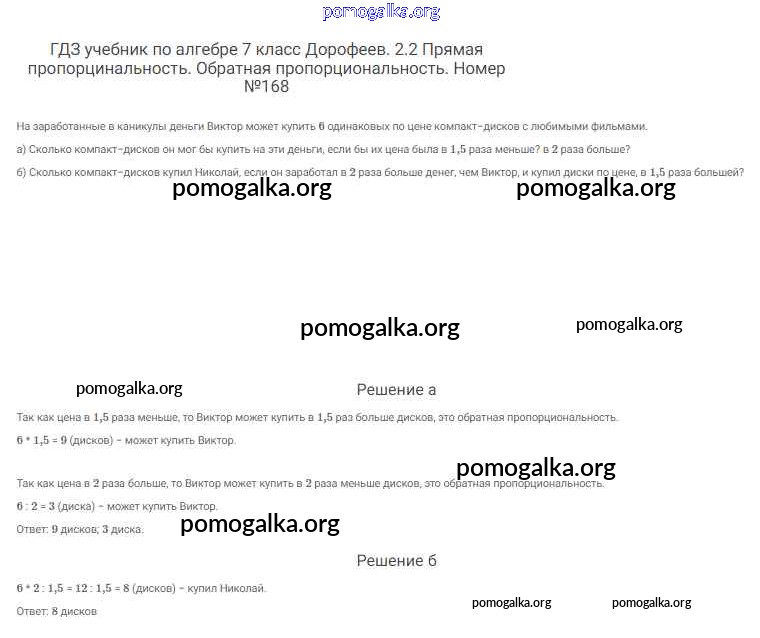 Готовые ответы - Алгебра 7 класс Дорофеев Г.В. - упражнение 168