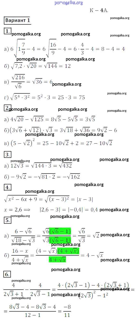Готовые ответы - Алгебра 8 класс Дидактические материалы Жохов В.И. - кр №4A контрольная работа вариант 1