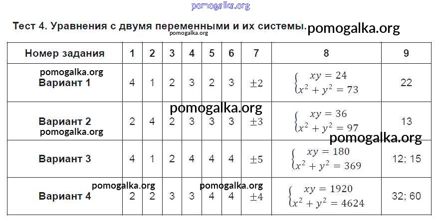 Готовые ответы - Алгебра 9 класс Тематические тесты Дудницын Ю.П. - тест Тест 4. Уравнения с двумя переменными и их системы