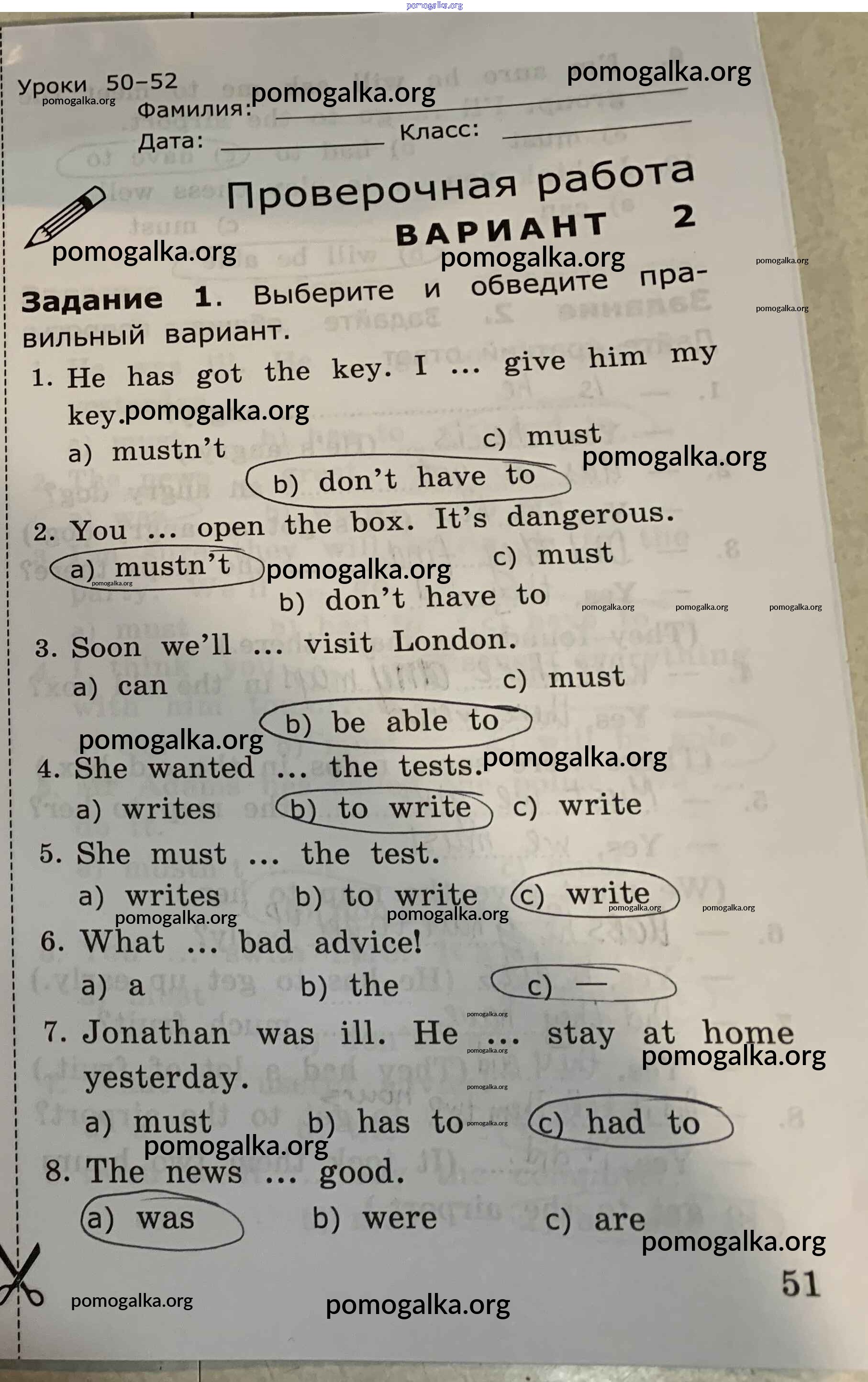 Готовые ответы - Английский язык. Грамматика английского языка 4 класс проверочные работы Барашкова Е.А. (к уч. Верещагиной) - страница 51