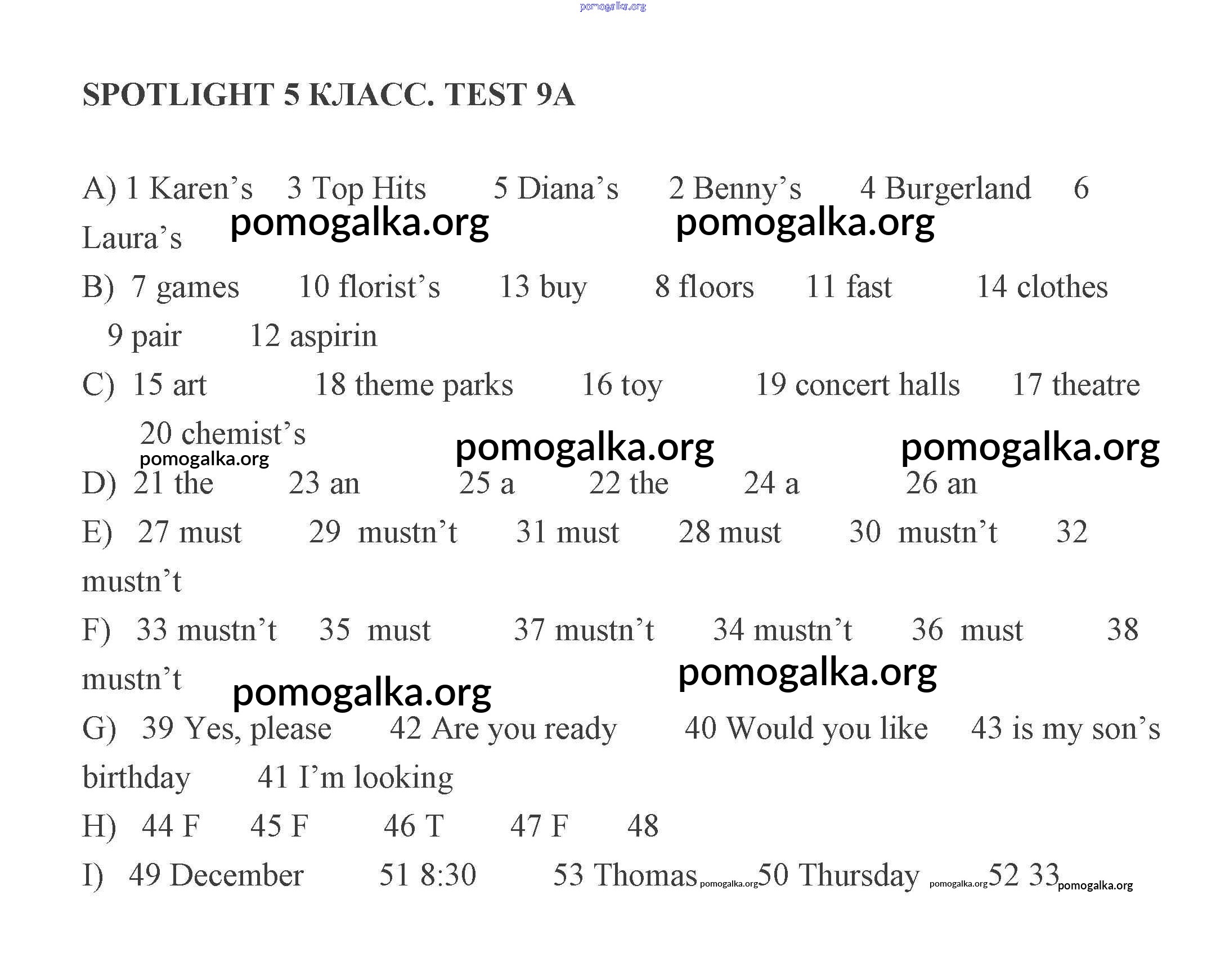 Готовые ответы - Английский язык 5 класс контрольные задания Ваулина Spotlight - тест 9 A