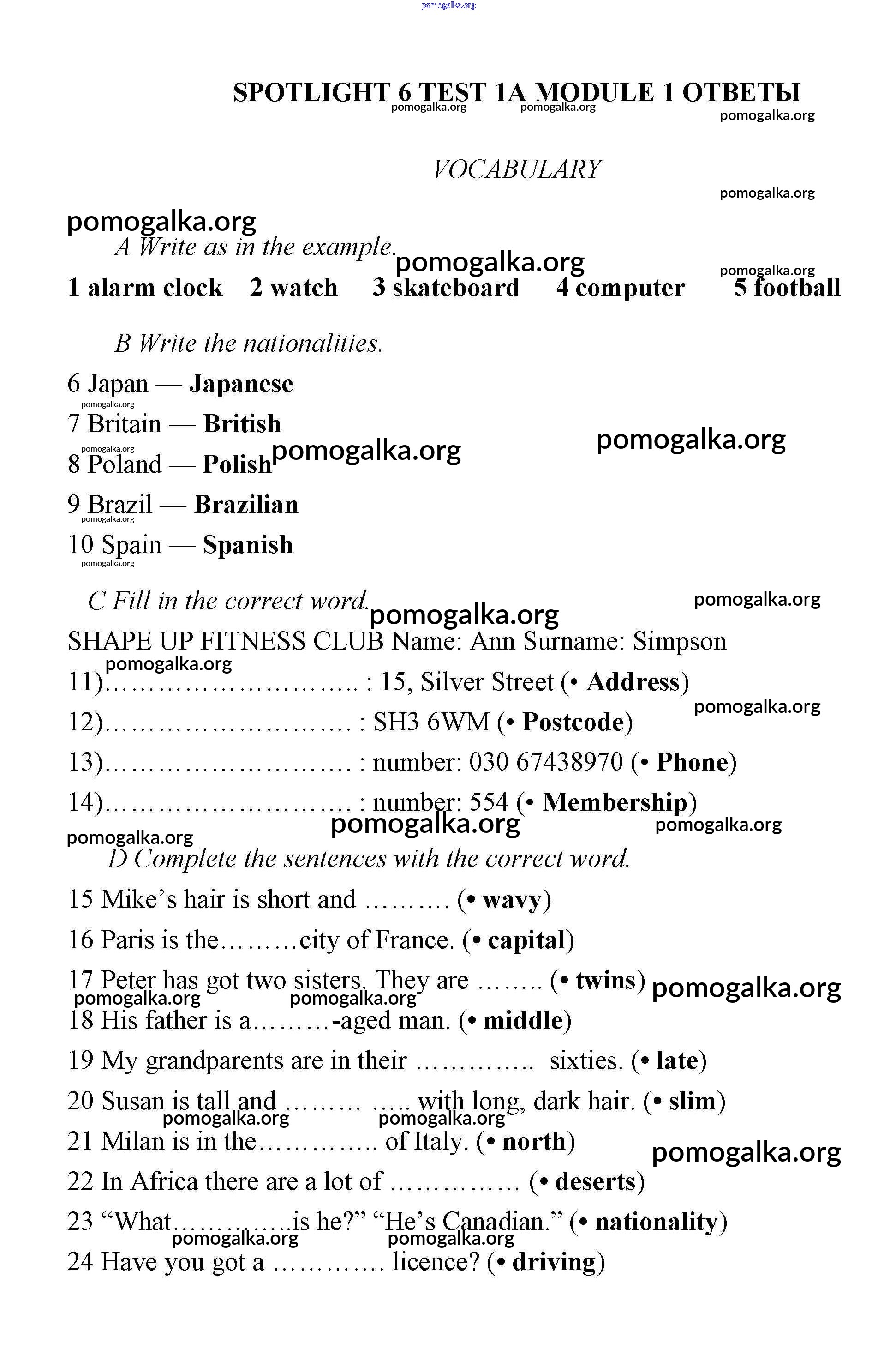 Готовые ответы - Английский язык 6 класс контрольные задания Ваулина Spotlight - тест 1A