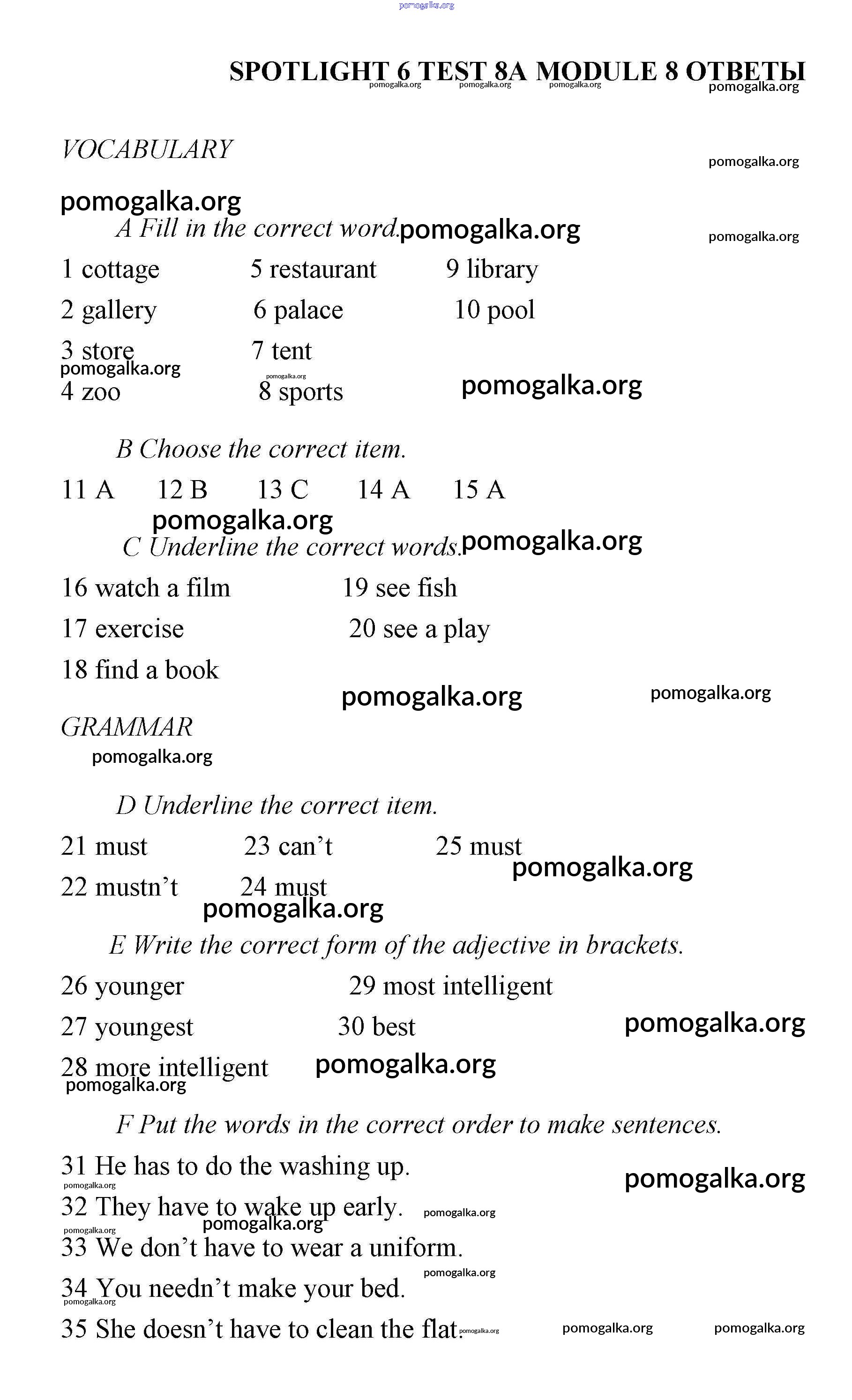 Готовые ответы - Английский язык 6 класс контрольные задания Ваулина Spotlight - тест 8А