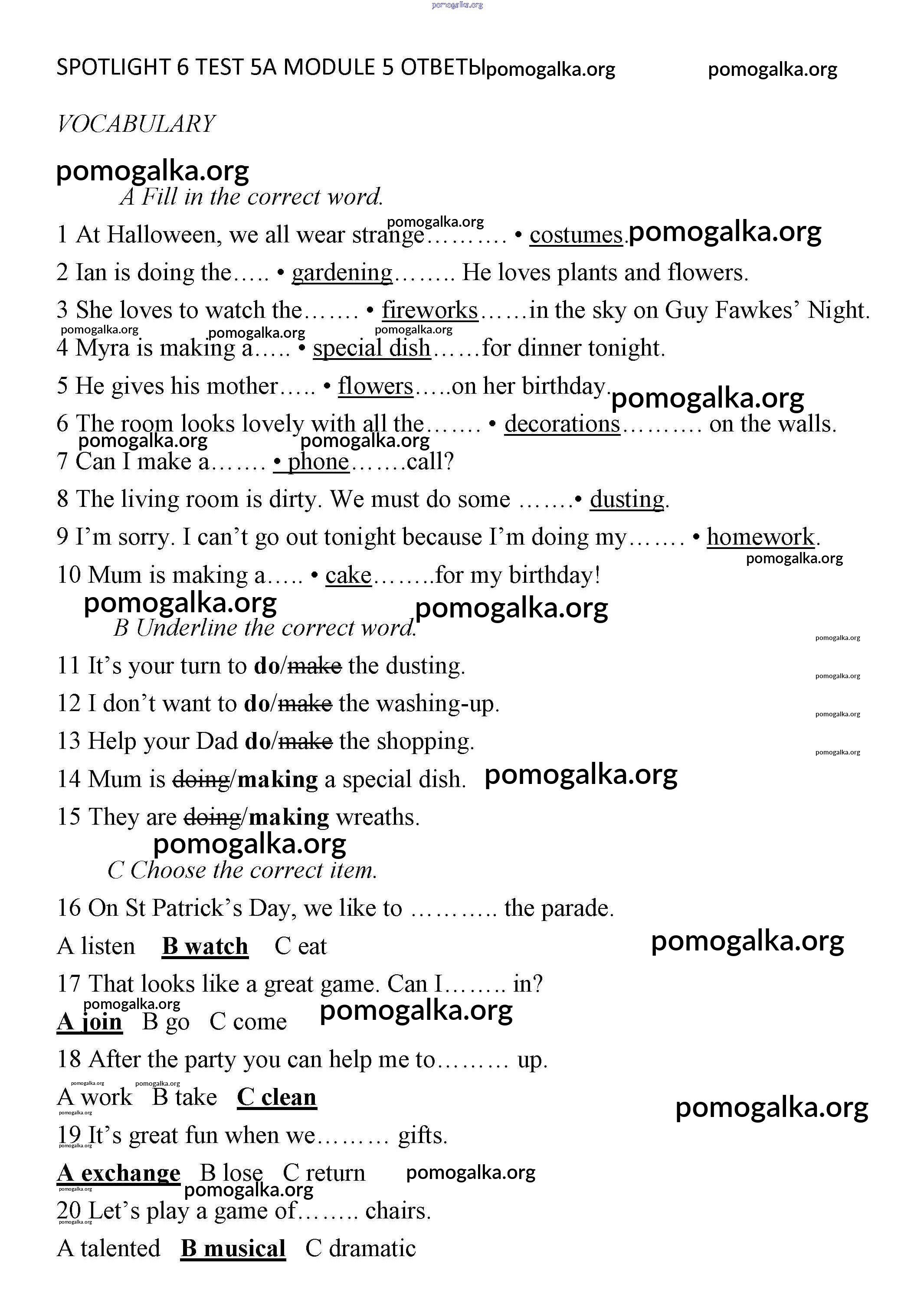 Готовые ответы - Английский язык 6 класс контрольные задания Ваулина Spotlight - тест 5А