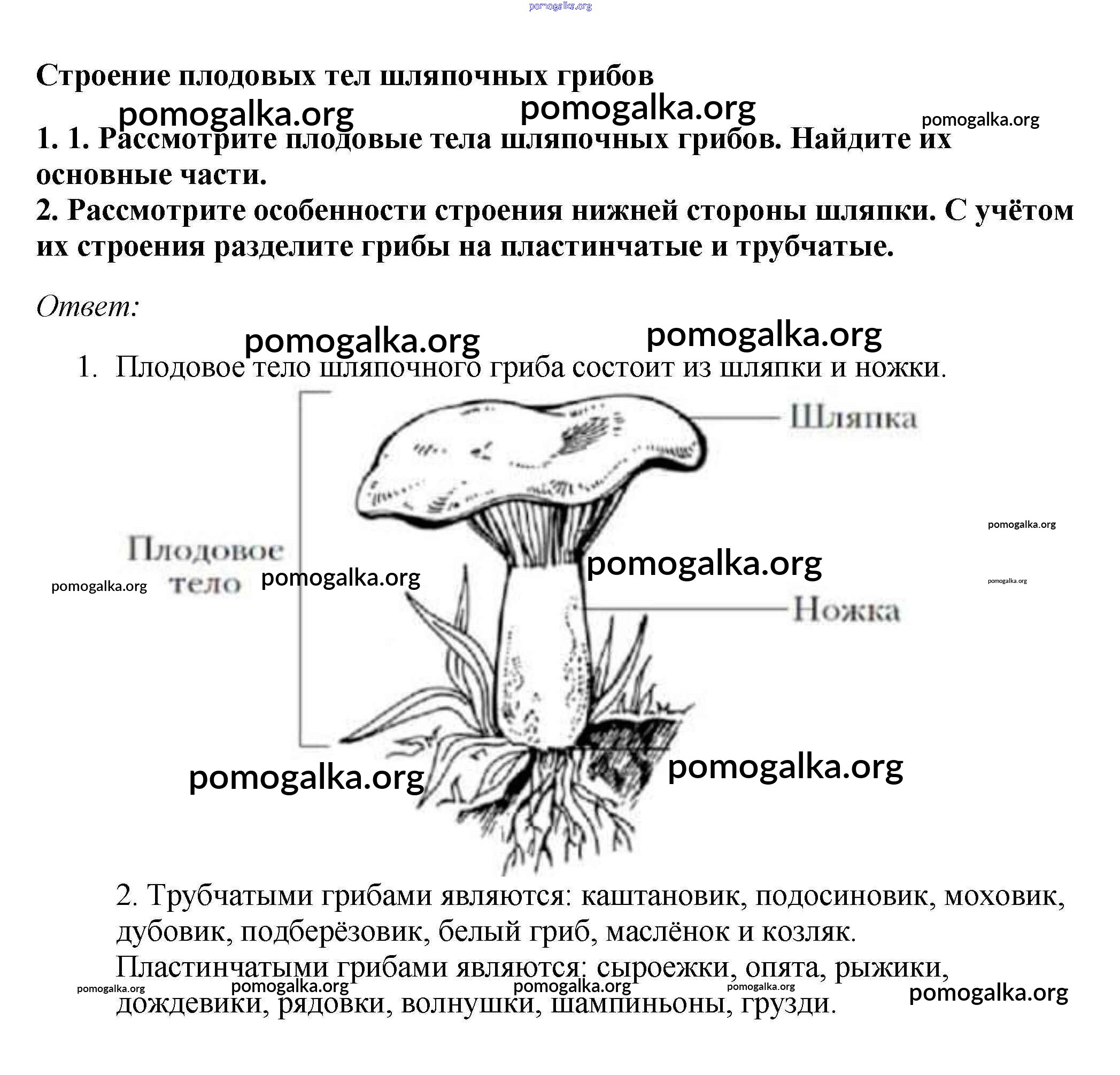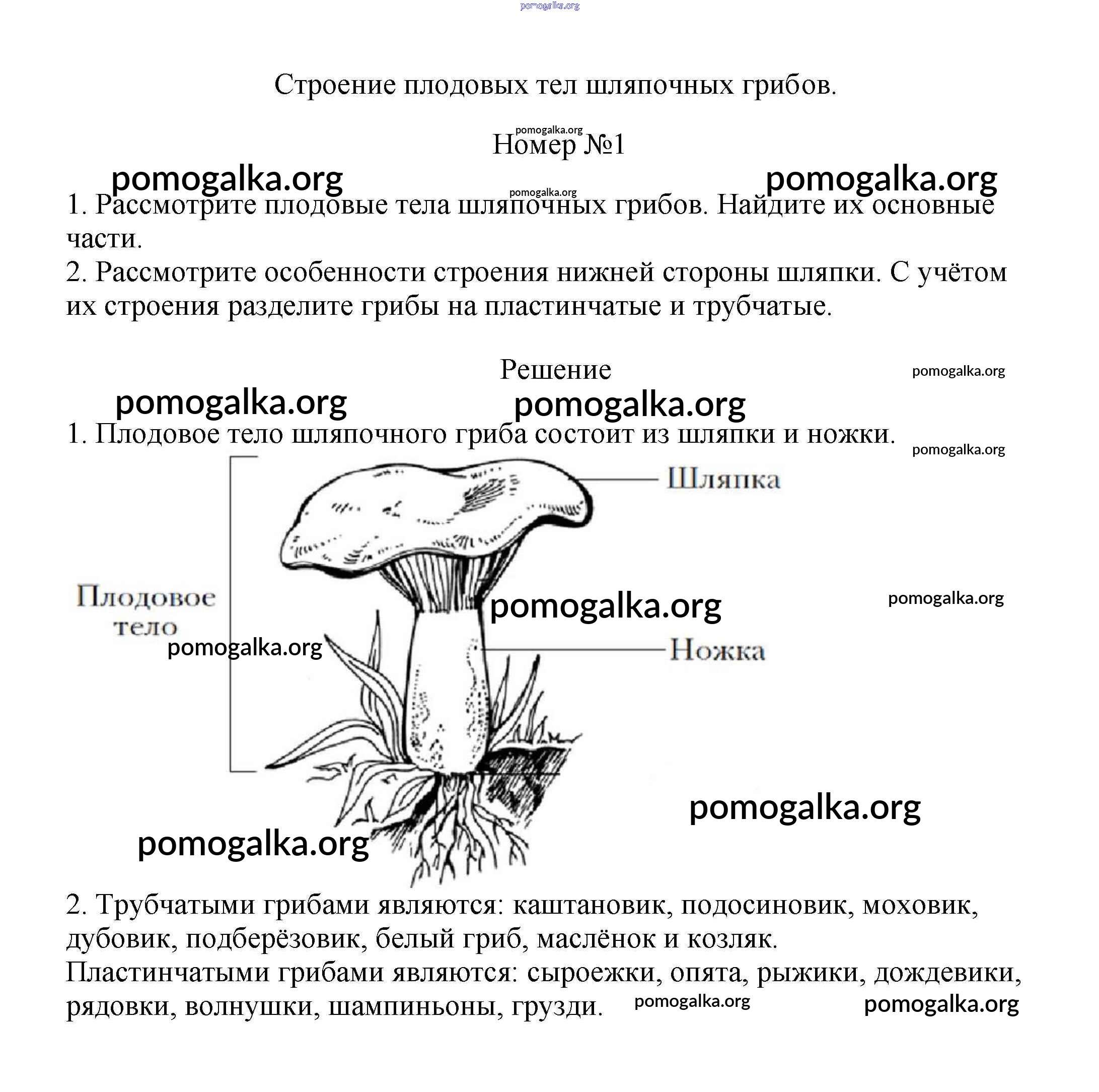 Готовые ответы - Биология 7 класс Пасечник В.В. - строение плодовых тел шляпочных грибов §20 1