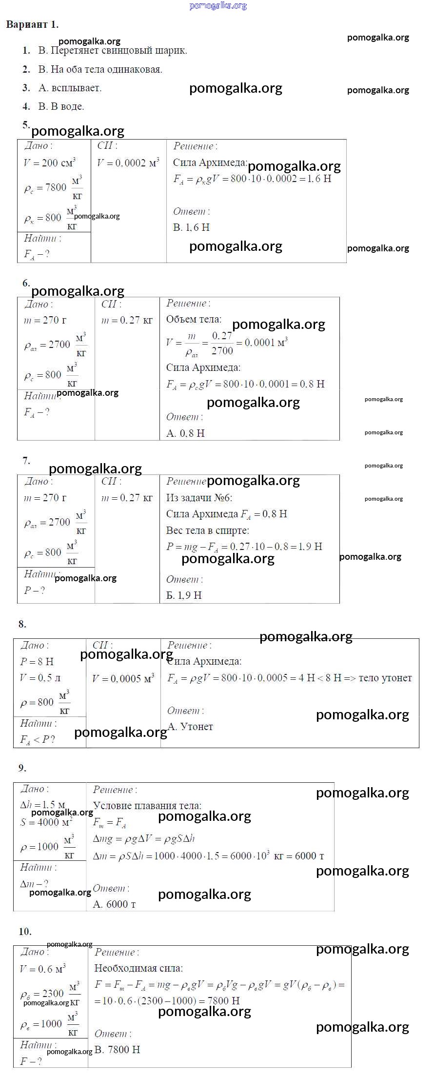 Тест №7. Архимедова сила. Плавание тел