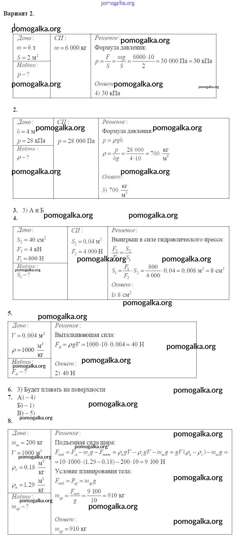 Готовые ответы - Физика 7 класс Контрольные и самостоятельные работы Громцева О.И. (к уч. Перышкина) - глава 3. давление твердых тел, жидкостей и газов контрольная работа Вар. 2