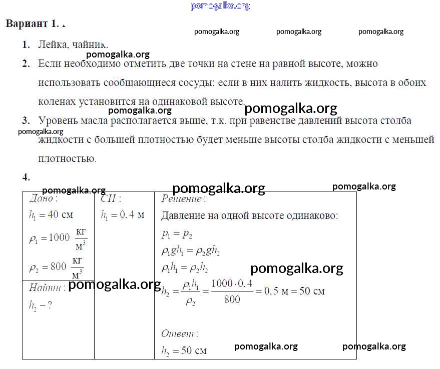 Готовые ответы - Физика 7 класс Контрольные и самостоятельные работы Громцева О.И. (к уч. Перышкина) - ср №30. сообщающиеся сосуды самостоятельная работа Вар. 1