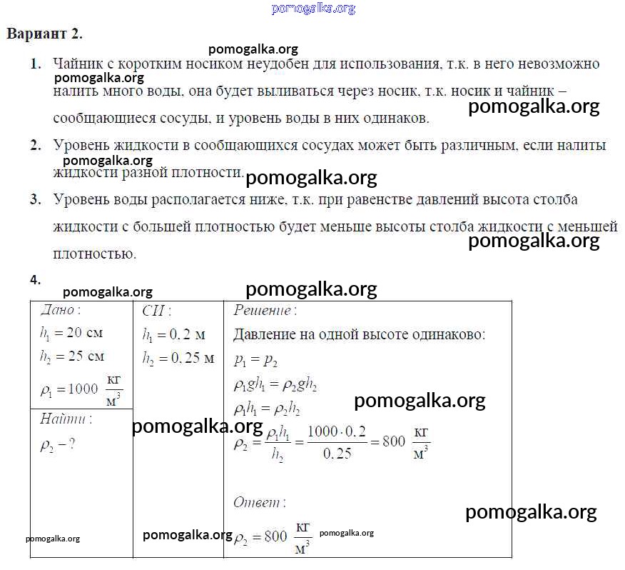 Готовые ответы - Физика 7 класс Контрольные и самостоятельные работы Громцева О.И. (к уч. Перышкина) - ср №30. сообщающиеся сосуды самостоятельная работа Вар. 2