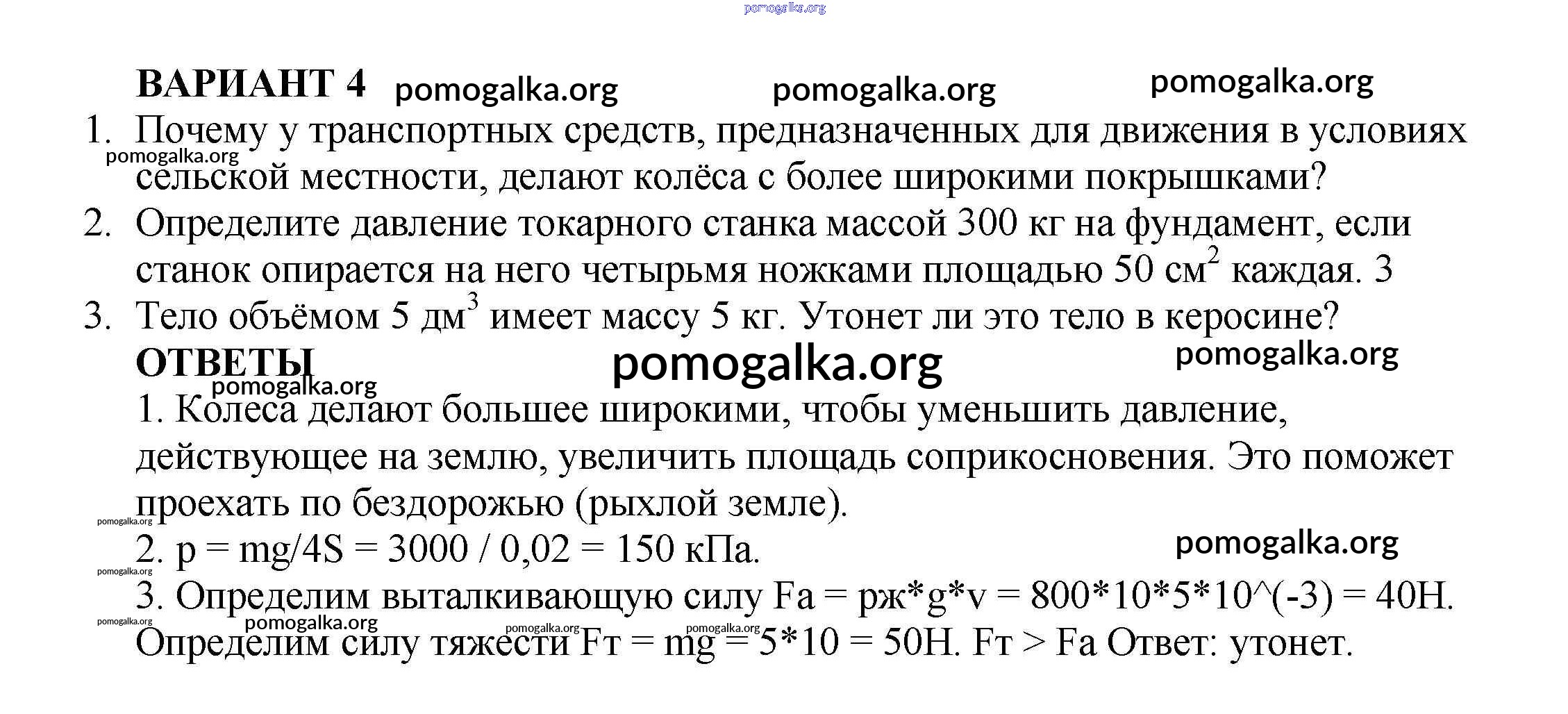 Готовые ответы - Физика 7 класс Самостоятельные и контрольные работы Марон А.Е. (к уч. Перышкина) - кр №-3. давление твердых тел, жидкостей и газов контрольная работа Вариант №4