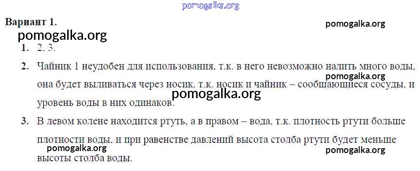 Готовые ответы - Физика 7 класс Самостоятельные и контрольные работы Марон А.Е. (к уч. Перышкина) - ср-№41. сообщающиеся сосуды самостоятельная работа Вариант №1
