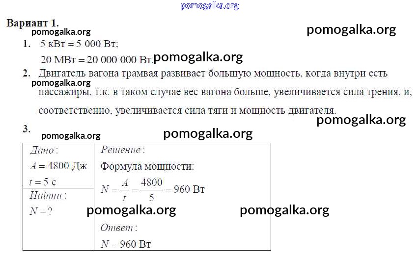 Готовые ответы - Физика 7 класс Самостоятельные и контрольные работы Марон А.Е. (к уч. Перышкина) - ср-№56. мощность. единицы мощности самостоятельная работа Вариант №1