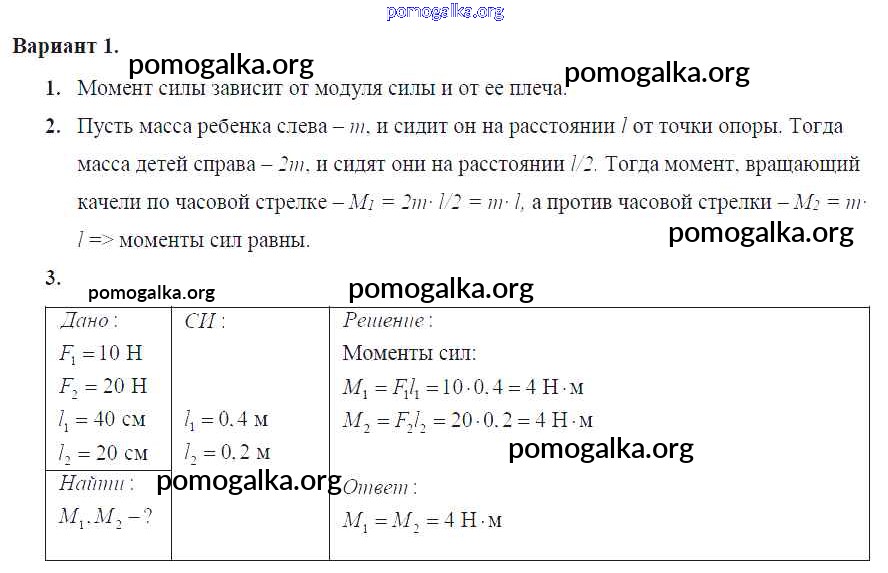 Готовые ответы - Физика 7 класс Самостоятельные и контрольные работы Марон А.Е. (к уч. Перышкина) - ср-№59. момент силы самостоятельная работа Вариант №1