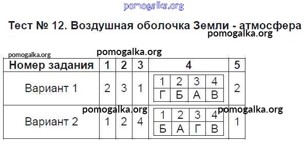 Готовые ответы - География 5 класс тесты Пятунин В.Б. (к уч. Летягина А.А.) - атмосфера Тест 12