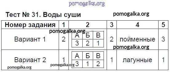 Готовые ответы - География 6 класс Тесты Пятунина О.А. (к уч. Летягина) - тест Тест-31. Воды суши