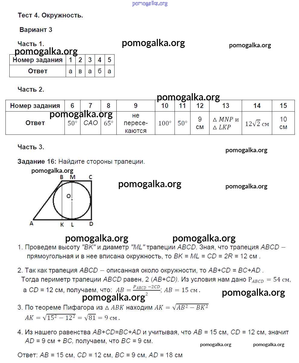 Готовые ответы - Геометрия 8 класс тесты Фарков А.В. (к уч. Атанасяна) - глава 4. окружность 3