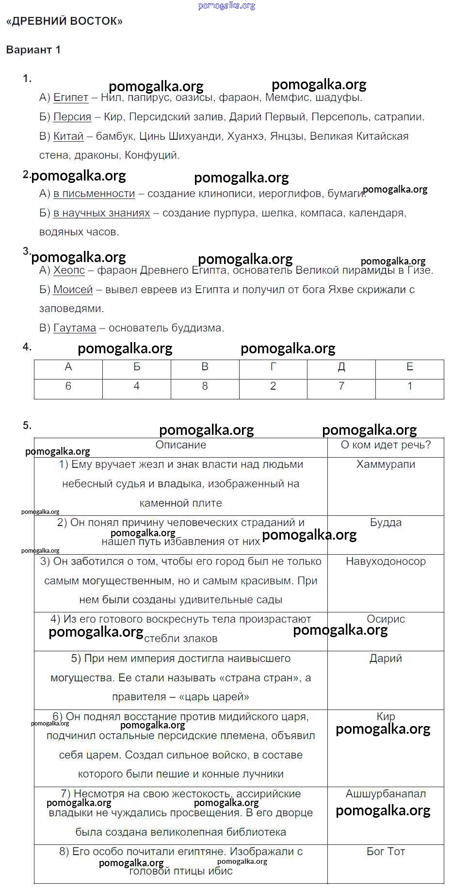 Готовые ответы - Всеобщая История 5 класс Тематический контроль Саплина Е.В. - кр-2 контрольная работа вариант №1