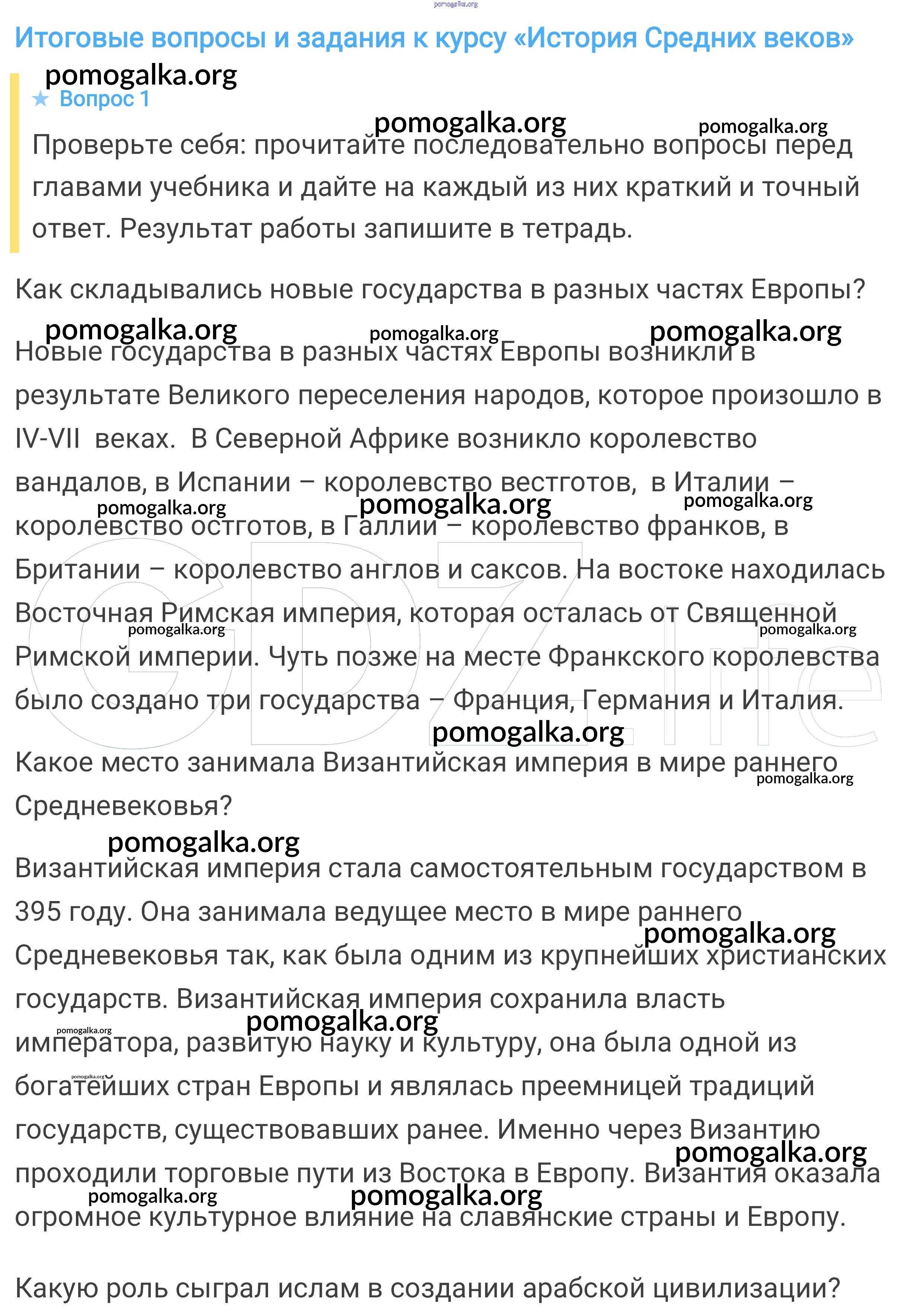 Готовые ответы - Всеобщая история. История средних веков 6 класс Агибалова Е.В. - итоговые вопросы и задания к курсу "История Средних веков" 1