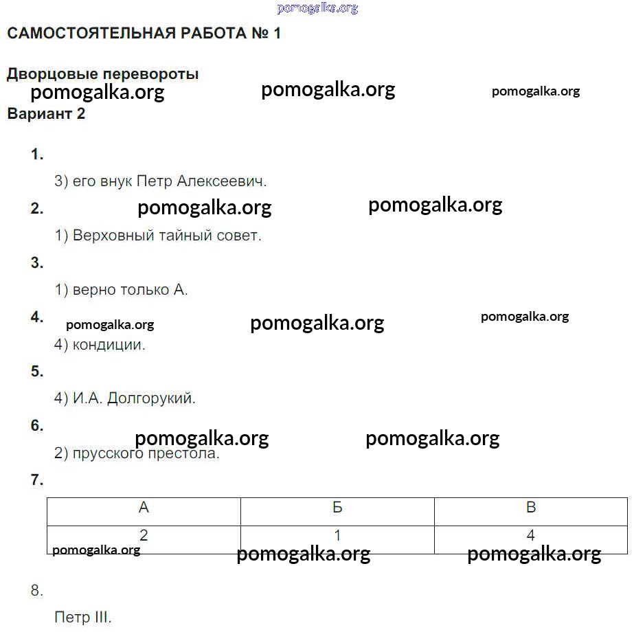 Готовые ответы - История 7 класс рабочая тетрадь. Тематический контроль Акиньшина О.Н. - ср-1 Российская империя в 1725-1762 гг Вариант 2