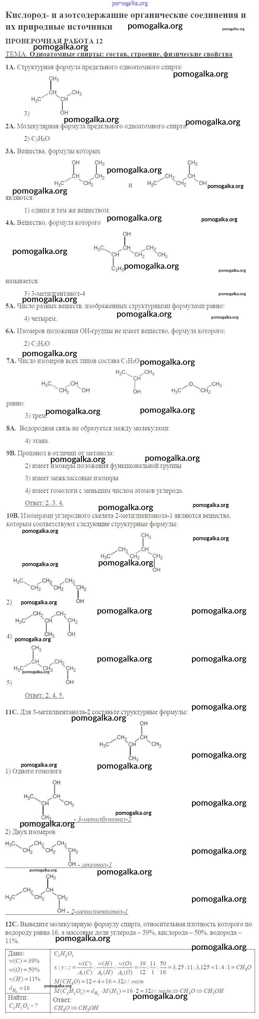 Готовые ответы - Химия 10 класс тетрадь для оценки качества знаний Габриелян О.С. - проверочная работа 12