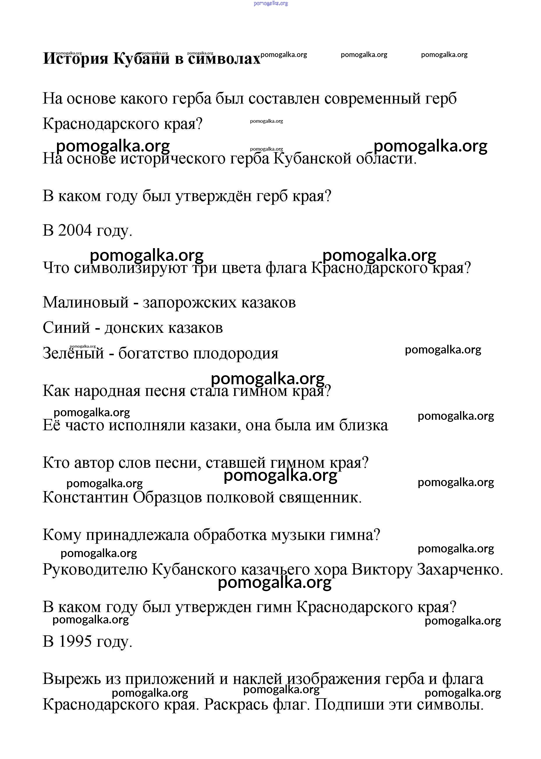 Готовые ответы - Кубановедение 3 класс рабочая тетрадь Науменко - тема История Кубани в символах