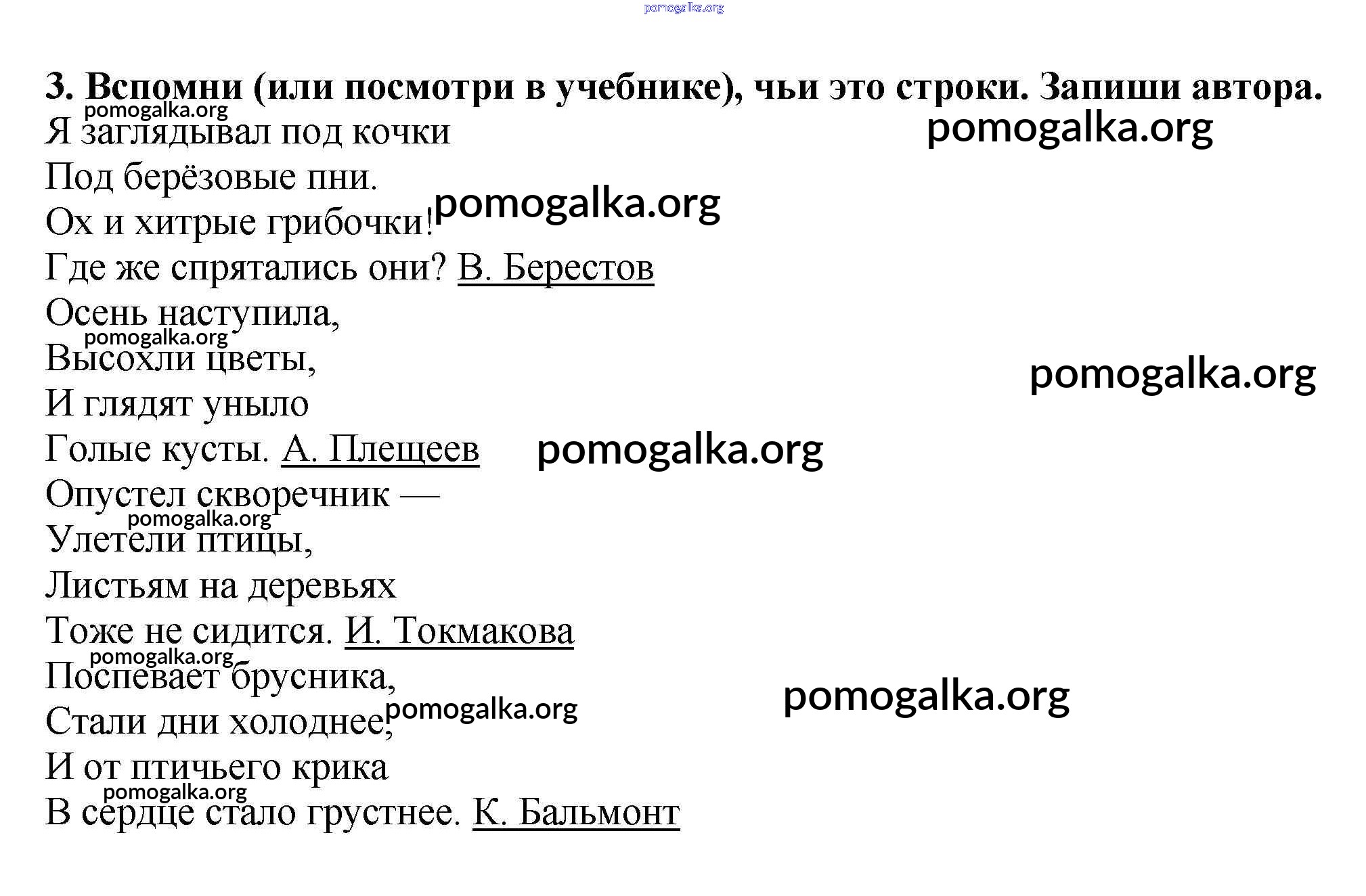 Трать меньше времени на решение домашнего задания. Зайдя на помогалку, вы найдете все подходящие ответы к Рабочей тетради Литература 2 класс Кутявина на упражнение Проверочная работа по теме «Осень» (страницы 26-27) 3