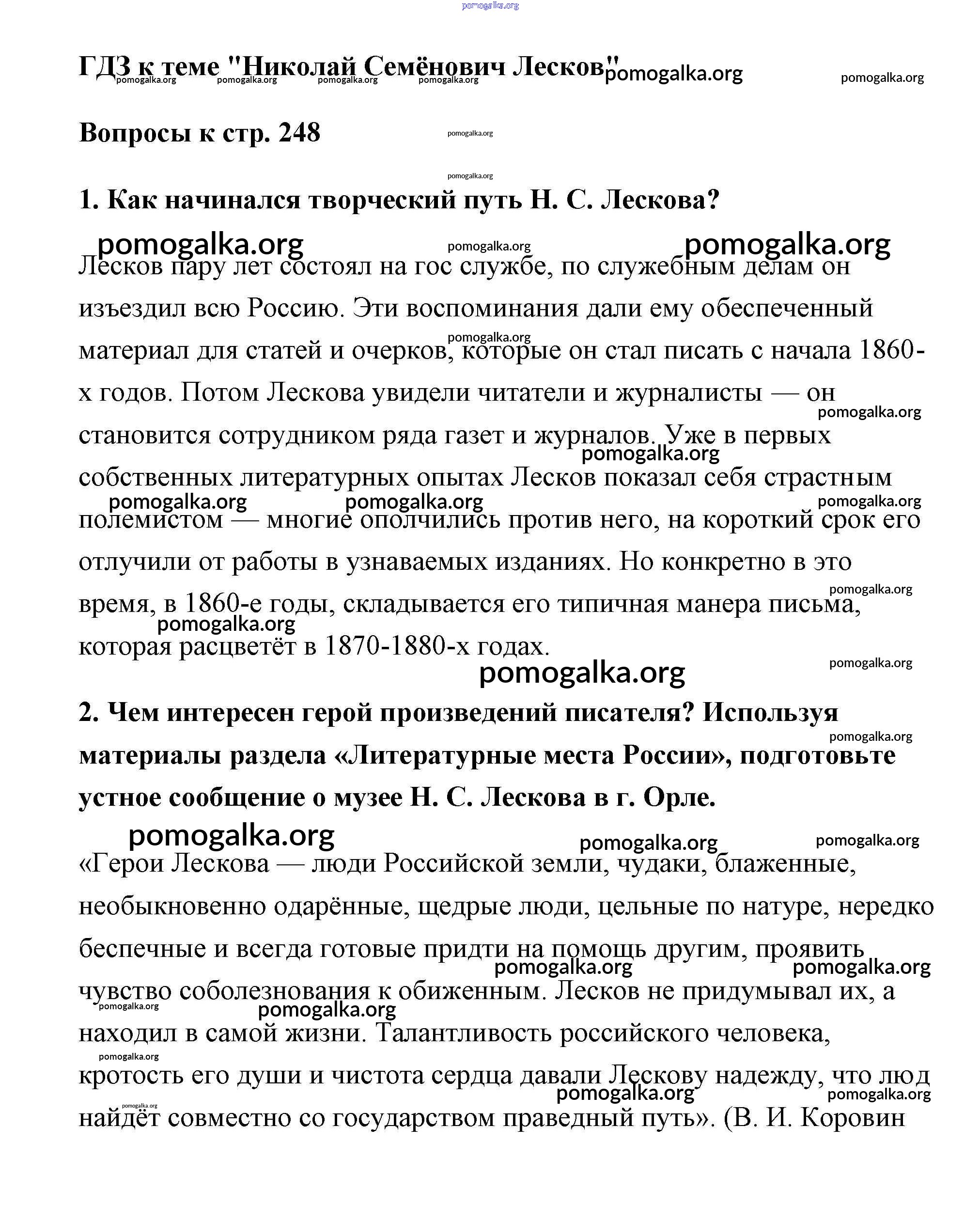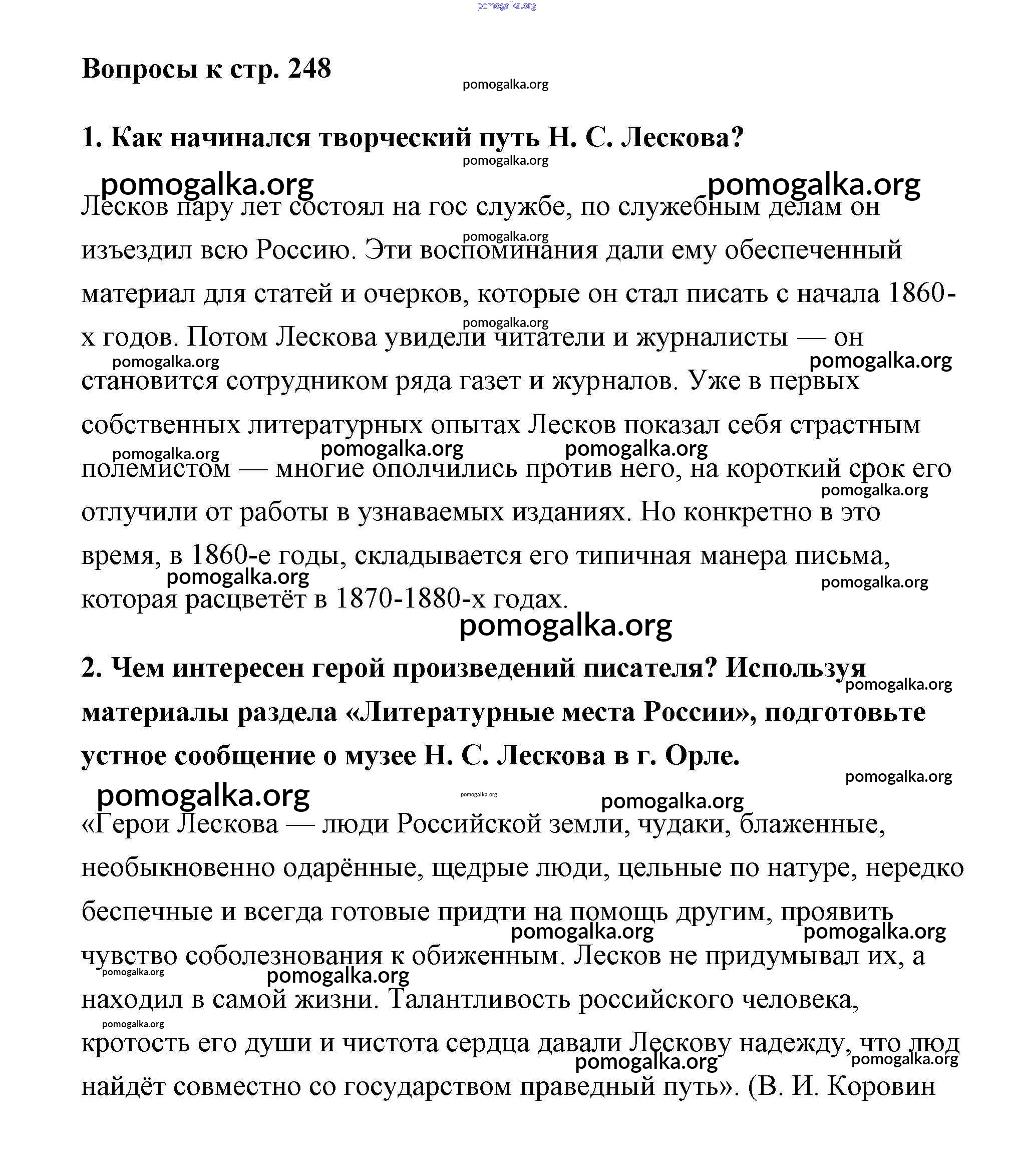 Готовые ответы - Литература 6 класс Коровина - Лесков часть 1 (старое 15-е издание) страница 248