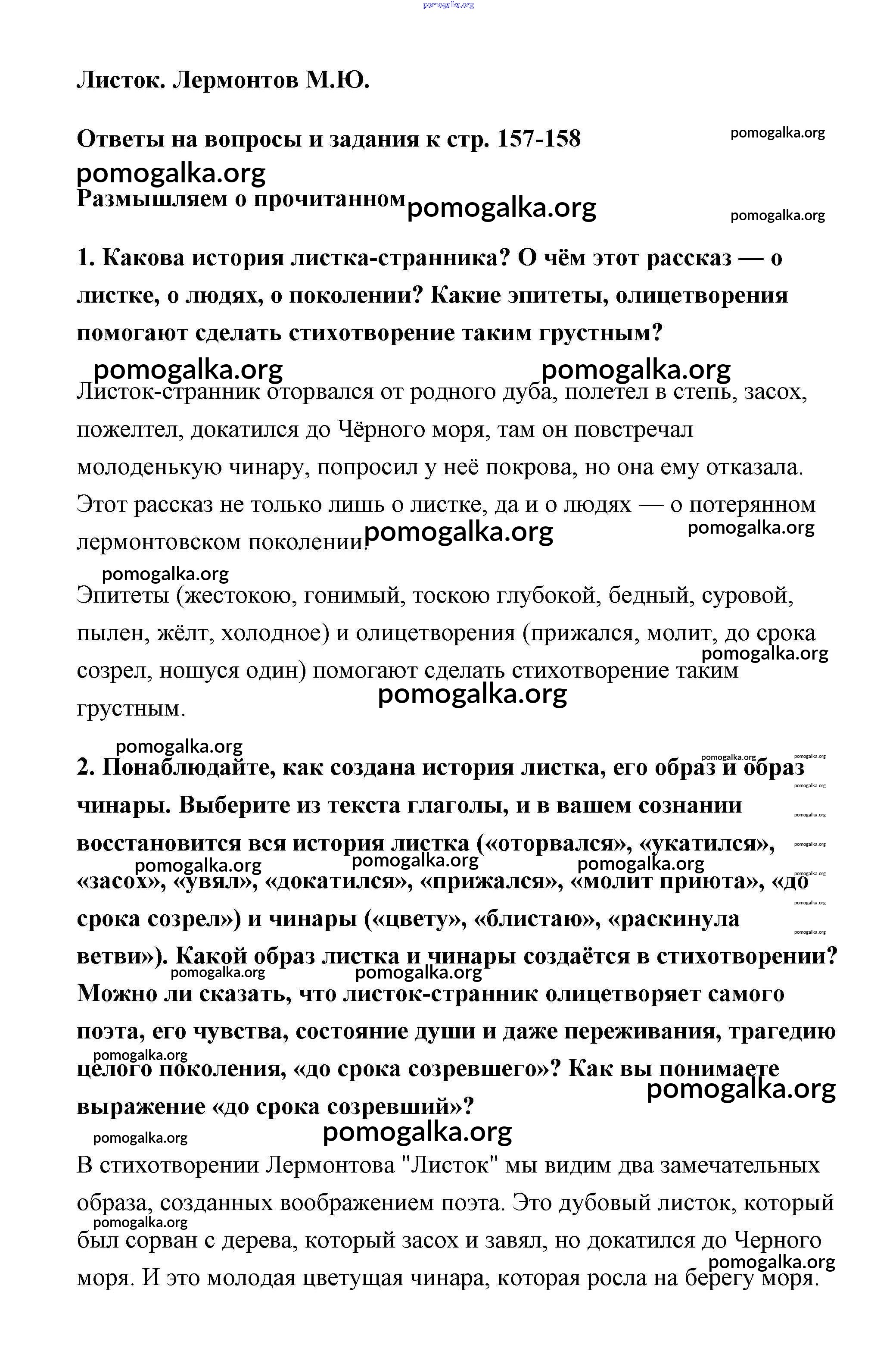 Готовые ответы - Литература 6 класс Коровина - Лермонтов часть 1 (новое 16-е издание) страница 157