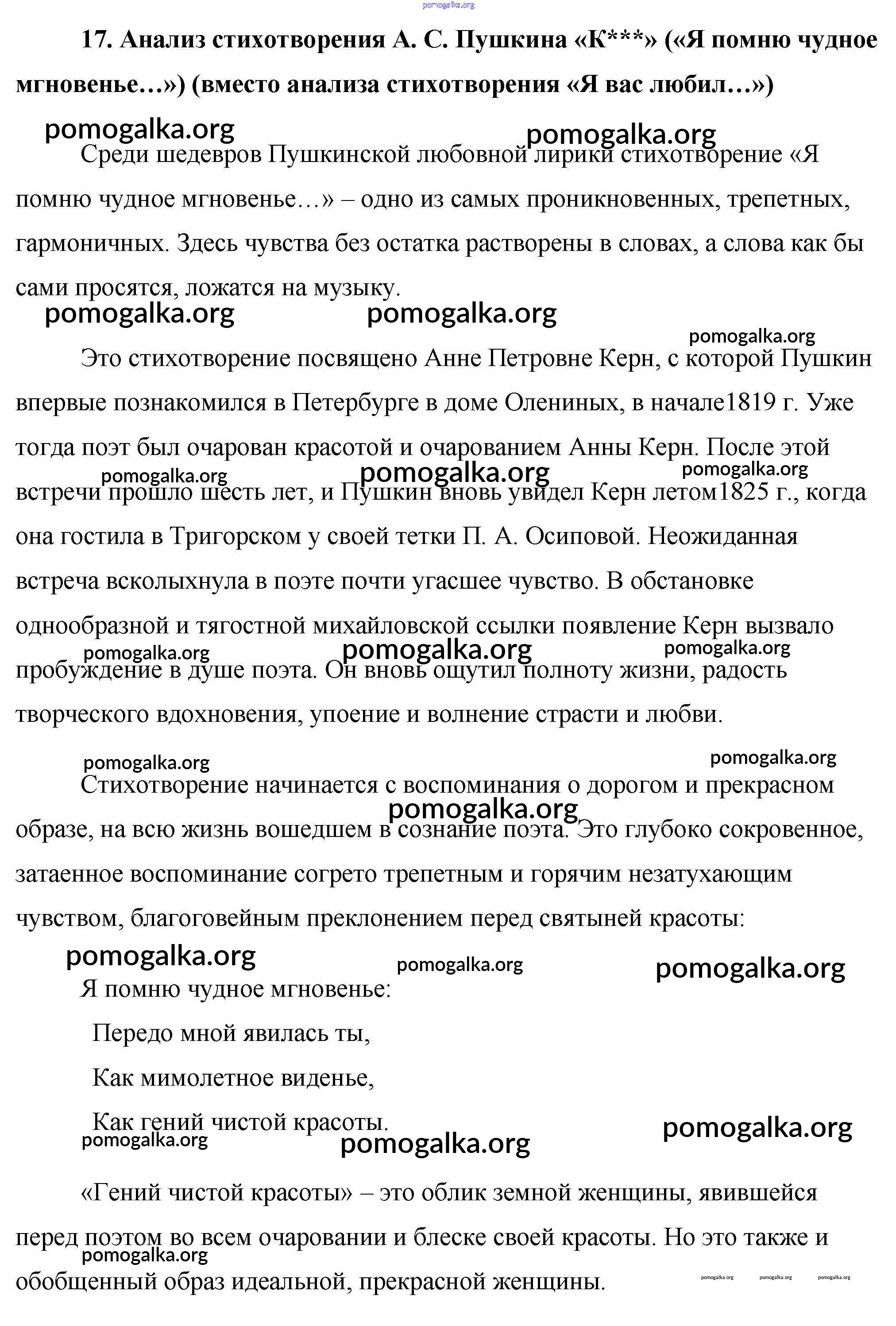 17. Анализ стихотворения А. С. Пушкина «К***» («Я помню чудное мгновенье…») (вместо анализа стихотворения «Я вас любил…»)