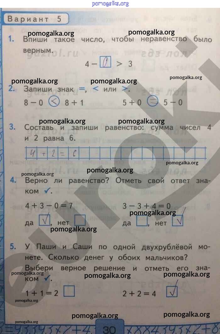 Готовые ответы - Математика 1 класс Контрольные работы Рудницкая В.Н. (к уч. Моро) - часть 2. страница 30