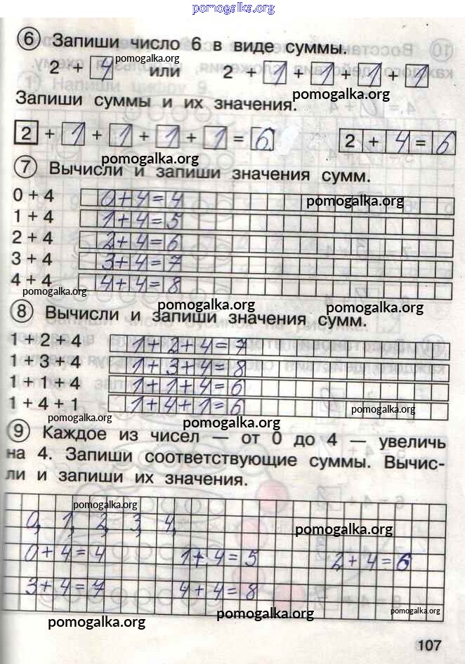 Готовые ответы - Математика 1 класс тетрадь для самостоятельной работы Захарова О.А. - тетрадь №1. страница 107
