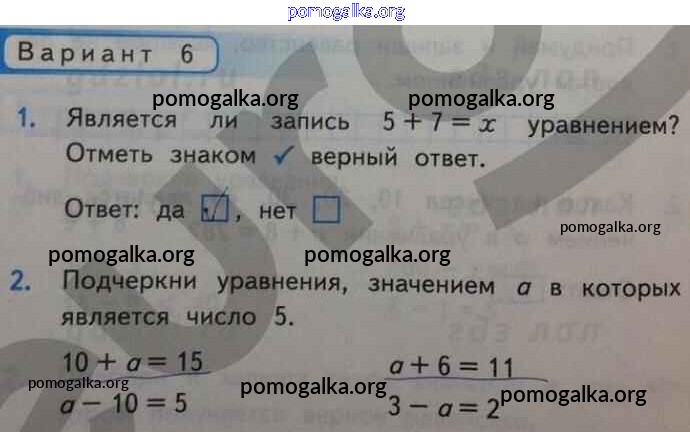 Готовые ответы - Математика 2 класс Контрольные работы Рудницкая В.Н. (к уч. Моро) - Уравнение часть 1 Вар-6