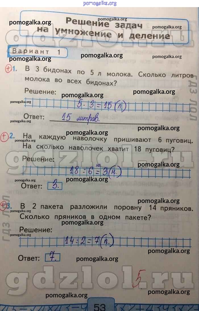 Готовые ответы - Математика 2 класс Контрольные работы Рудницкая В.Н. (к уч. Моро) - Решение задач на умножение и деление часть 2 Вар-1