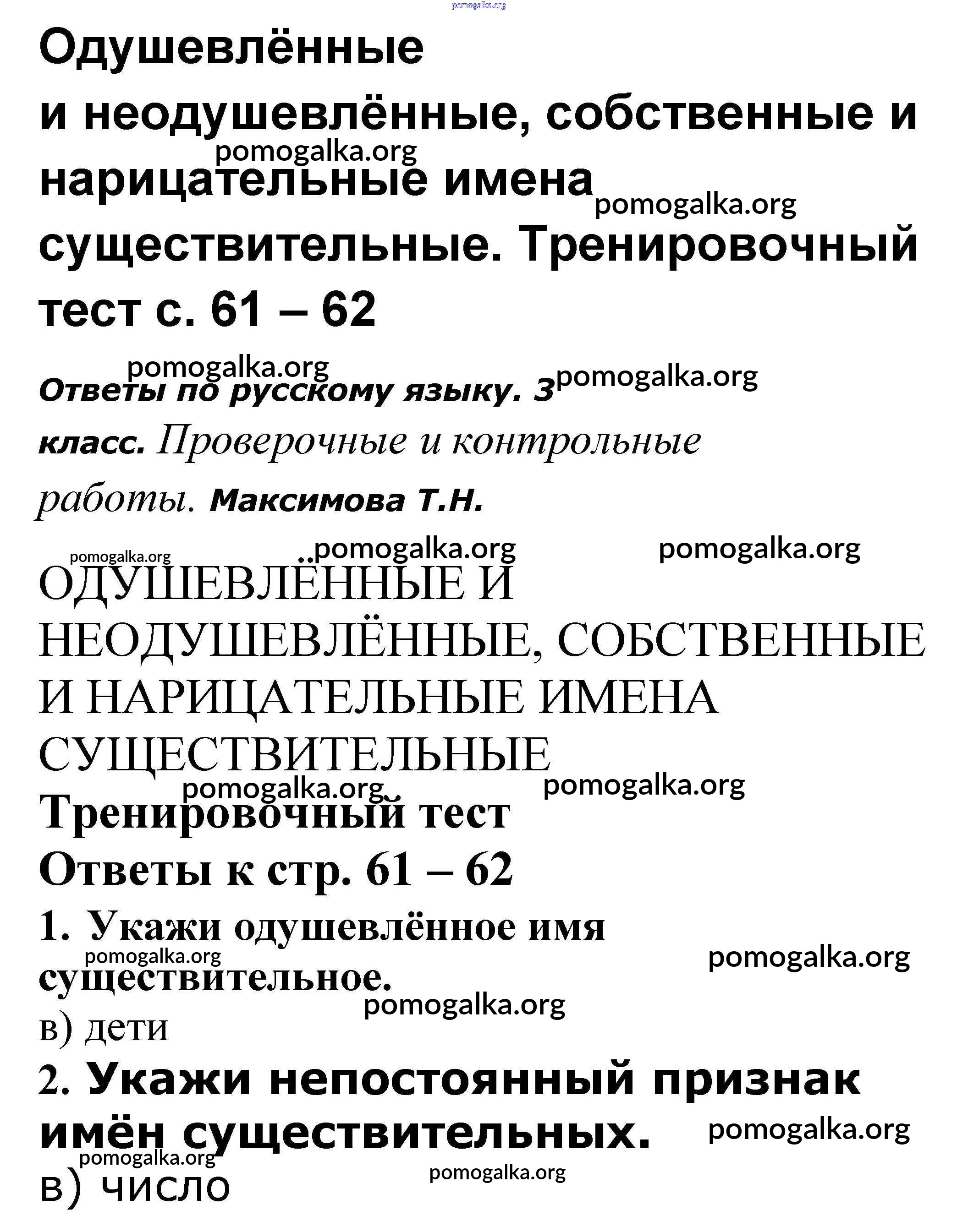 Готовые ответы - Русский язык 3 класс проверочные и контрольные работы Максимова Т.Н. - Одушевлённые и неодушевлённые, собственные и нарицательные имена существительные 61-62
