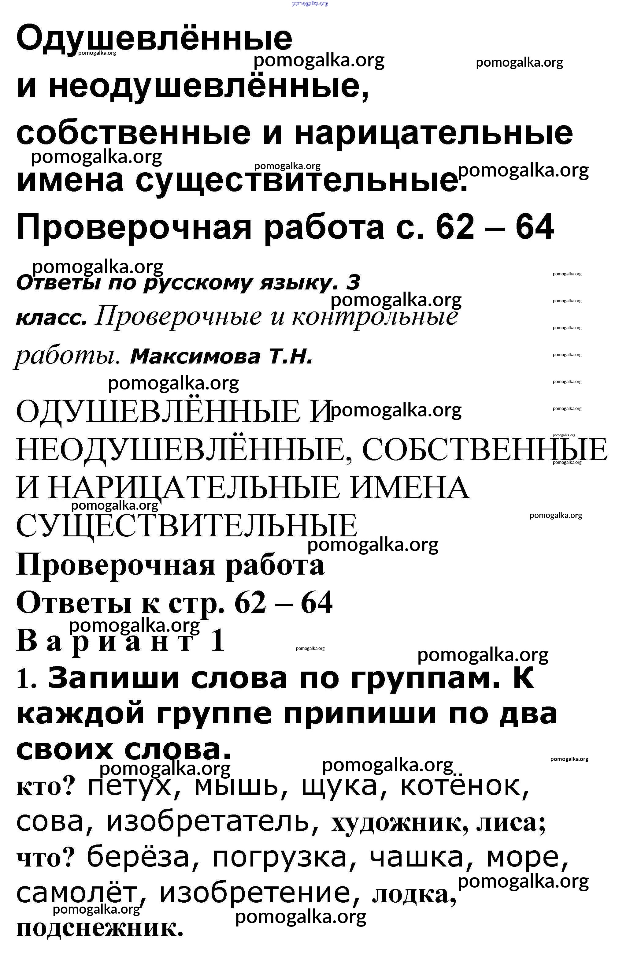Готовые ответы - Русский язык 3 класс проверочные и контрольные работы Максимова Т.Н. - Одушевлённые и неодушевлённые, собственные и нарицательные имена существительные 62-64