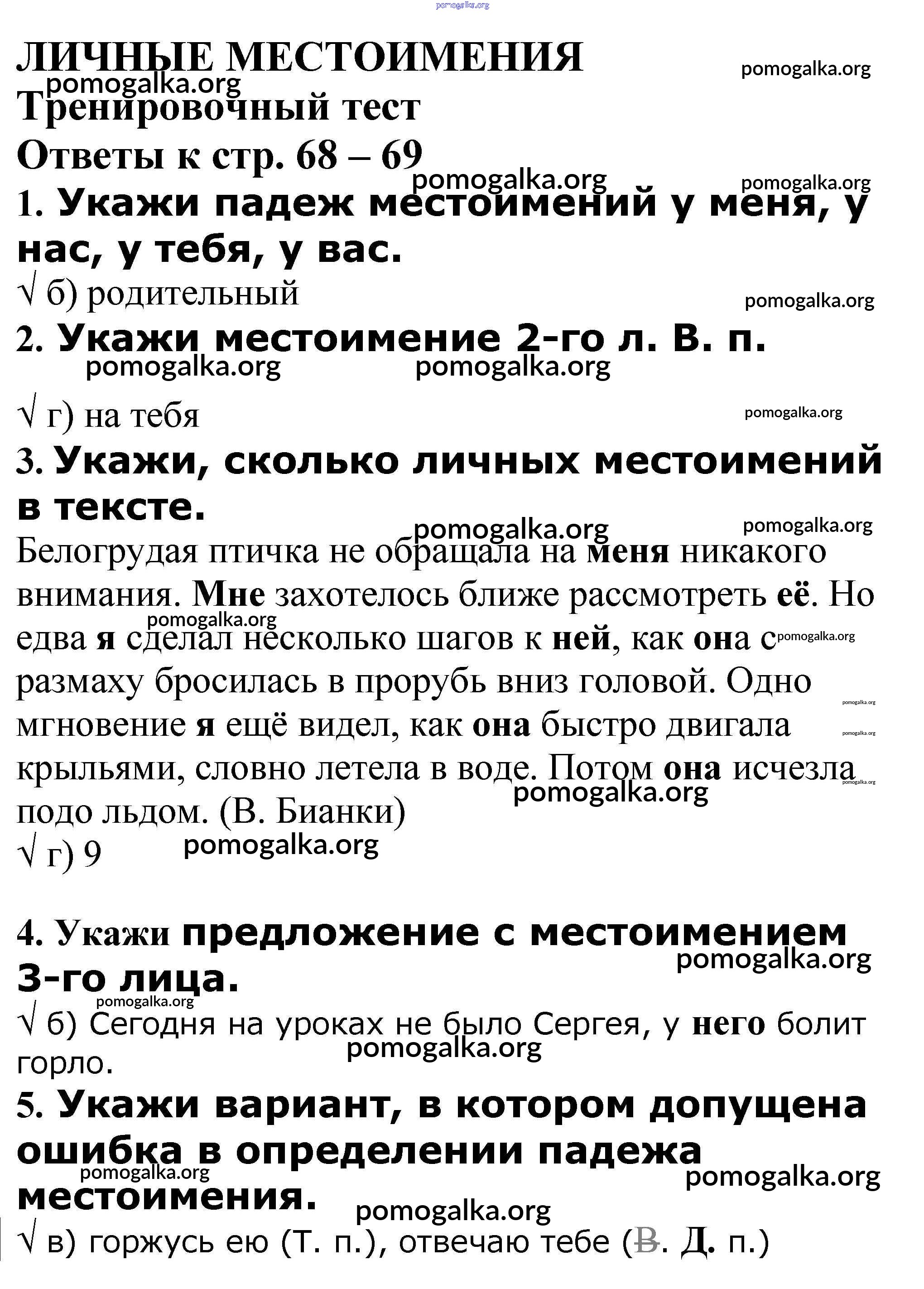 Готовые ответы - Русский язык 4 класс проверочные и контрольные работы Максимова Т.Н. - личные местоимения Тренировочный тест стр. 68 – 69