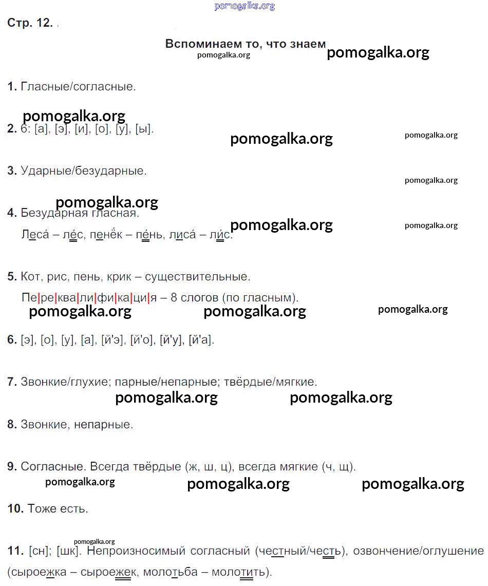Готовые ответы - Русский язык 4 класс Бунеев Р.Н. - часть 1. страница вспоминаем, то что знаем 12